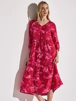 Låt färgen tala med denna böljande och livfulla klänning som kombinerar komfort med feminin elegans. Det vackra blommönstret i nyanser av rött, rosa och lila ger ett uttrycksfullt intryck, perfekt för vårens och sommarens alla tillfällen.