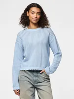 En klassisk stickad tröja med rund hals och långa ärmar. Tröjan har ribbade muddar och en mjuk, bekväm passform – perfekt för både en avslappnad och trendig look. CASHMERE BLUE