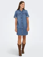 Denimklänning med skjortkrage, korta ärmar och knäppning framtill. Designad med bröstfickor med knapp och dekorativa sömmar i en bekväm standard fit.
