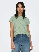 En avslappnad och stilren topp med rund hals, korta ärmar och uppvikta muddar. Den är längre än standardlängd och har vackra spetsdetaljer för en feminin touch. Perfekt för vardagens alla tillfällen. FROSTY GREEN