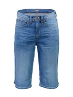 Stretchiga jeansshorts med femficksmodell och bekväm längd till knät – en tidlös och mångsidig favorit för varma dagar. CLEAR BLUE