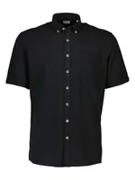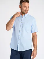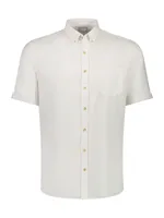 Denna enfärgade kortärmade skjorta är ett mångsidigt plagg som passar perfekt både till vardag och semesterdagar. Den är tillverkad i en luftig blandning av bomull och linne, vilket ger en naturligt sval och mjuk känsla – perfekt för varma dagar. Skjortan har en tidlös design med button down-krage, knäppning framtill och en klassisk bröstficka som tillför funktion och stil. Den enfärgade ytan gör skjortan extra lätt att matcha – bär den till chinos för en uppklädd känsla eller kombinera med shorts för en mer avslappnad look. Med sin avslappnade passform erbjuder den både komfort och stil i ett. Ett självklart val i en sommargarderob som vill vara både praktisk och elegant.