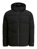 Svart och hållbar herrjacka i vävd polyester med återvunnen fyllning. Kort modell med huva, dragkedja och sidfickor.